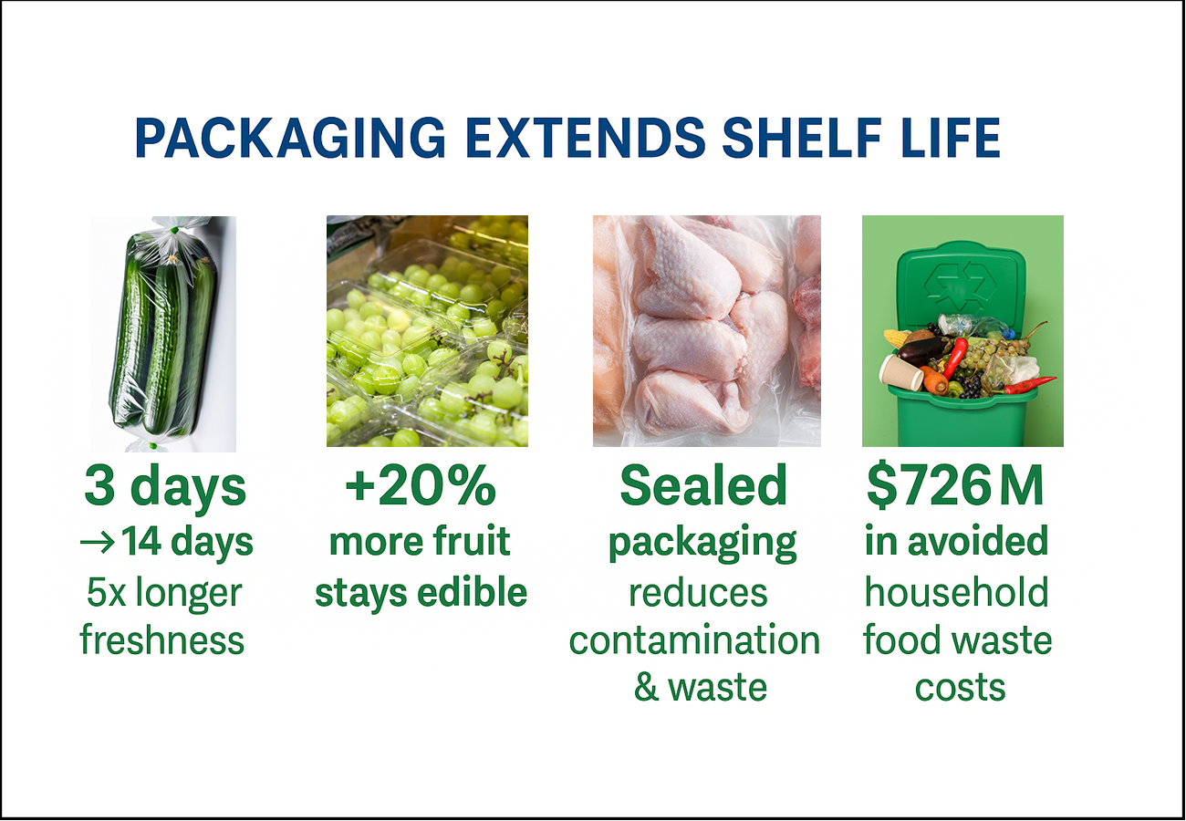 Plastic packaging that prevents just 10% of food from spoiling nets a Greenhouse Gas (GHG) benefit that is at least 5× larger than the emissions from producing the packaging itself.*